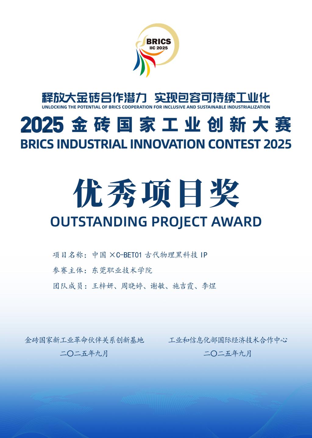 我校创意设计与传媒学院教师陈惠华、易熙琼指导的《中国xC-BET01古代物理黑科技IP》项目(团队成员:王梓妍、周晓婷、谢敏、施吉霞、李煜)在本次国际总决赛中摘得优秀项目奖,是“工业设计”赛道中“文化传承与产业创新设计”赛项的唯一获奖项目,展现了我校学子的卓越创新能力与跨学科合作精神。本次大赛的经历不仅是一份荣誉,更是一次能力的全面提升和视野的巨大开拓。学生团队表示,将继续深耕项目,希望未来能将方案真正落地应用,为工业创新与文化传承贡献一份青春力量。